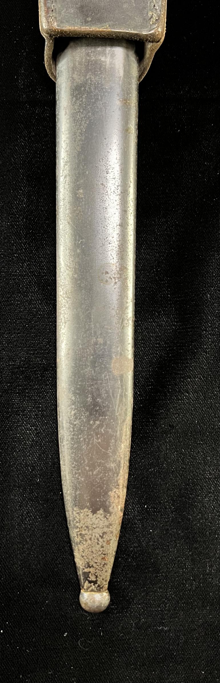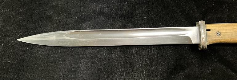 We will start with the Bayonet itself. There are no Waffen stamps any where on the bayonet. The grips are wood. the blade is stamped 456 and it appears that there was a number under this larger stamped 456. The Blued blade is in great shape but to me its not the typical German Blued finish. The Scabbard has no Waffen stamps or a serial number or factory listing. The scabbard appears to have the correct German blued finish. It all Greek to me, just could not leave it sitting there.