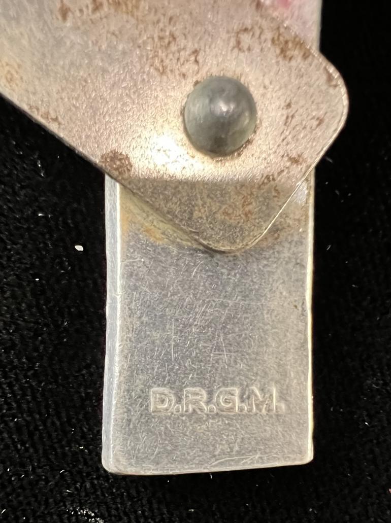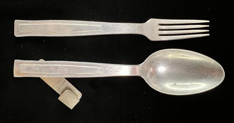 This is another variation of the commercial fork and spoon used by the German military personal.Just a simple fork and spoon there is a raised area onthe spoon handle to accept the indentation in the fork handle. The is a affixed swing clip to hold them together. The spoon is marked DRGM and Germany of the reverse side.