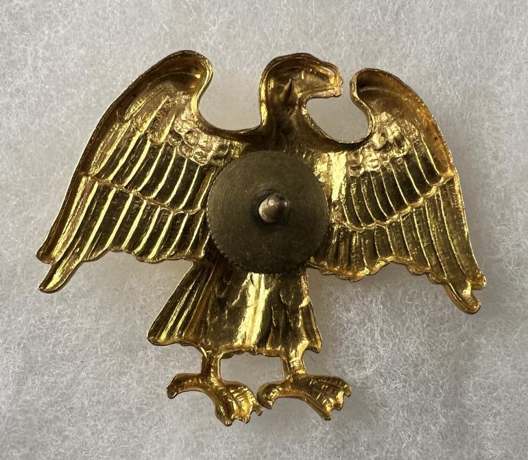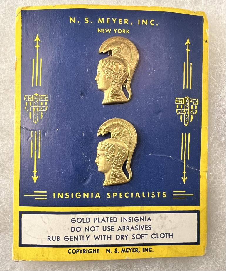 The cap badge is a beautiful gold Eagle which the photo does not capture how great it looks. The reverse has a threaded stud with a bronze mounting disk. There are no makers mark. The two collar insignia are still on the original N.F. Meyer heavy card display.