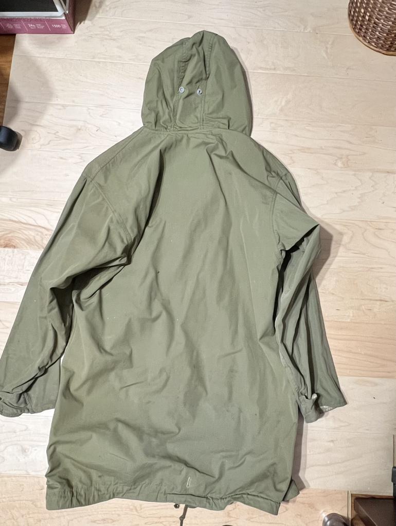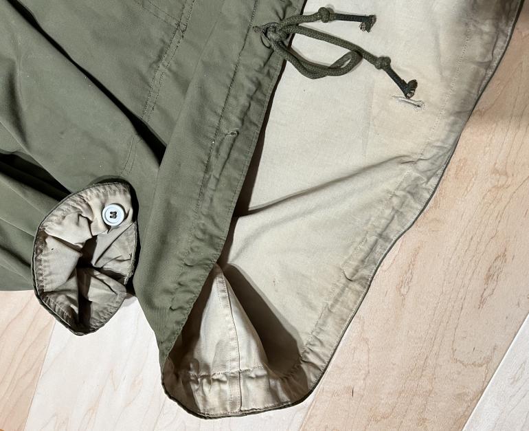 The parka has the green side showing and I do not see any rips or holes in the fabric. The green cloth is heavier that I usually see. All the correct color buttons and the draw strings are present.The White inside is dirty along the cuff and around the neck head portion of the hood. This Parka will make a great display as is showing usage.