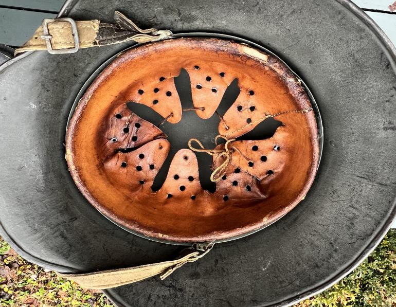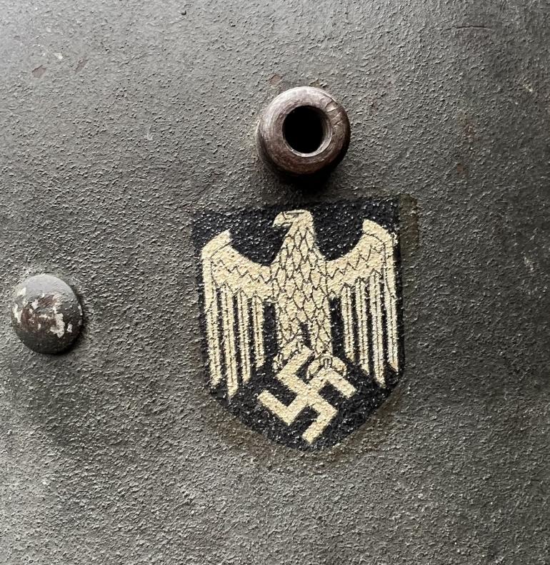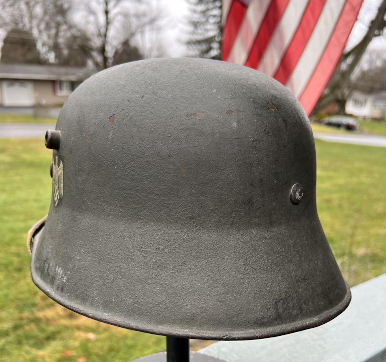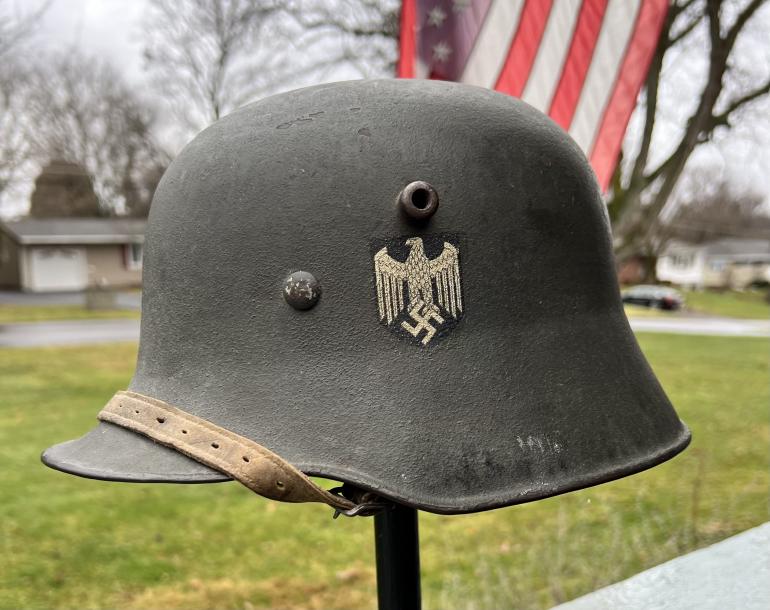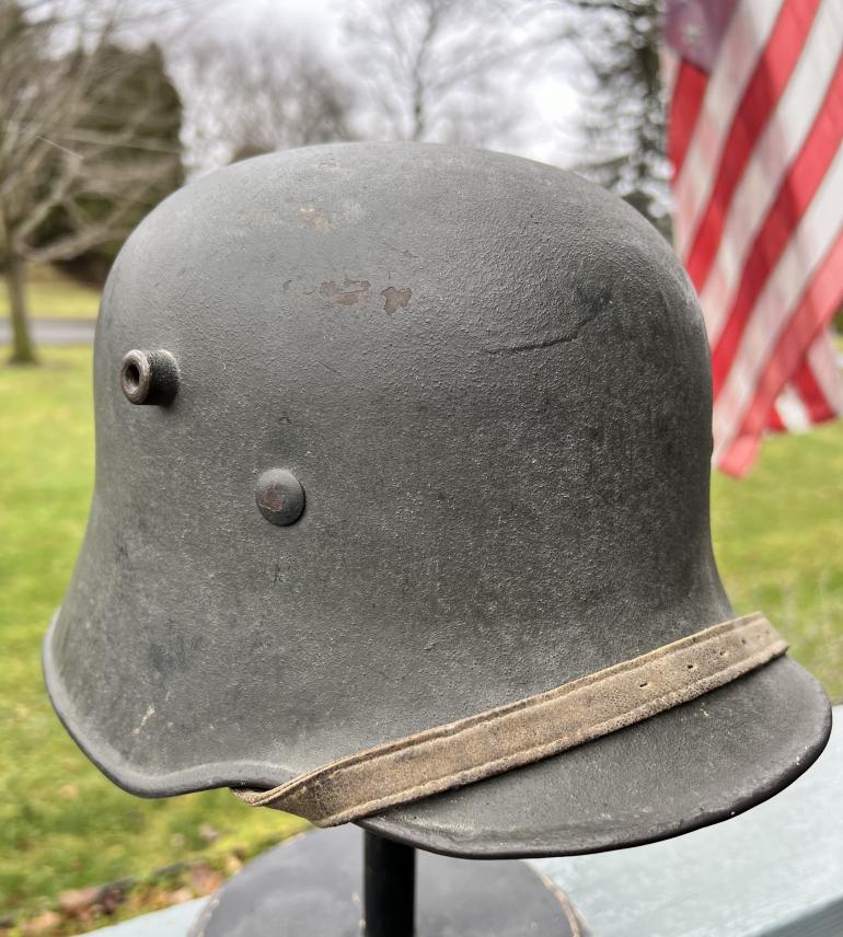 If I still collected German Helmets this one would be on my shelf. Its that nice!This Q68 Helmet has around 95+ of the original paint. The paint loss is around the lip of the helmet. The decal would rate 100%. The liner is complete but the draw string is present but has been broken over the years. The rivets are original along with the correct washers. Just noticed there is a 1" area on the edge of the leather liner that some mouse must have eater. The chin strap is also complete but the very end of the strap is missing. This is a great hard to find large size Trans SD helmet and would look great on anyone's shelf.