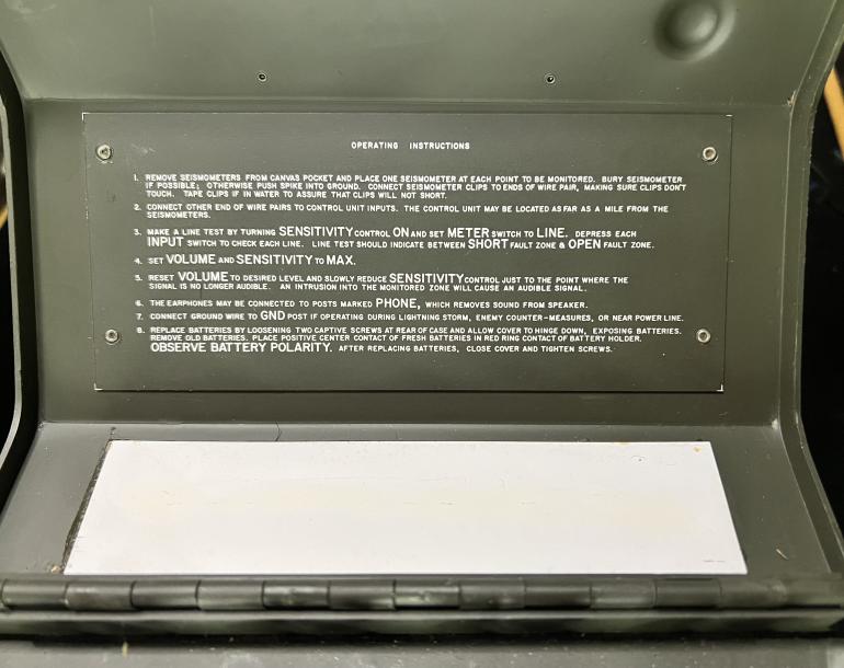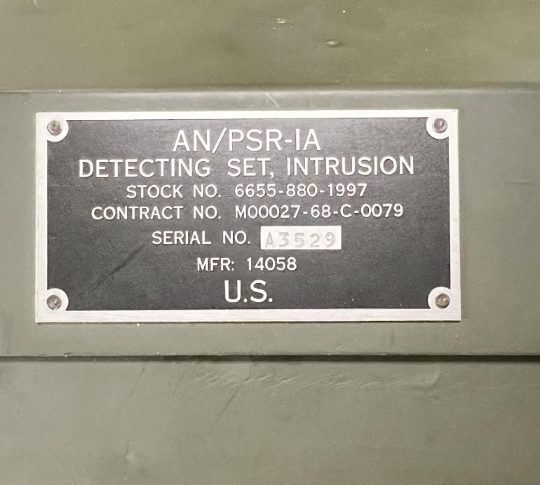 This set is complete and could not have been used more than once or twice.Here is a brief breakdown on the unit that I copied off the internet. Marine Corps Earth Vibration Intrusion Detecting Set The Marine Corps Earth Vibration Intrusion Detecting Set AN/PSR-1A (FSN 6655-880-1967) was a battery-powered device that detected ground vibrations through four geophone sensors. Included are the following 1-Carrying bag and strap no.14058 40569-1, 2- Control Set for four ground detectors, 3- USMC TM-04704B-15, 4-Four ground detectors, 5-One ground stake, 6- Set of Head Phones.