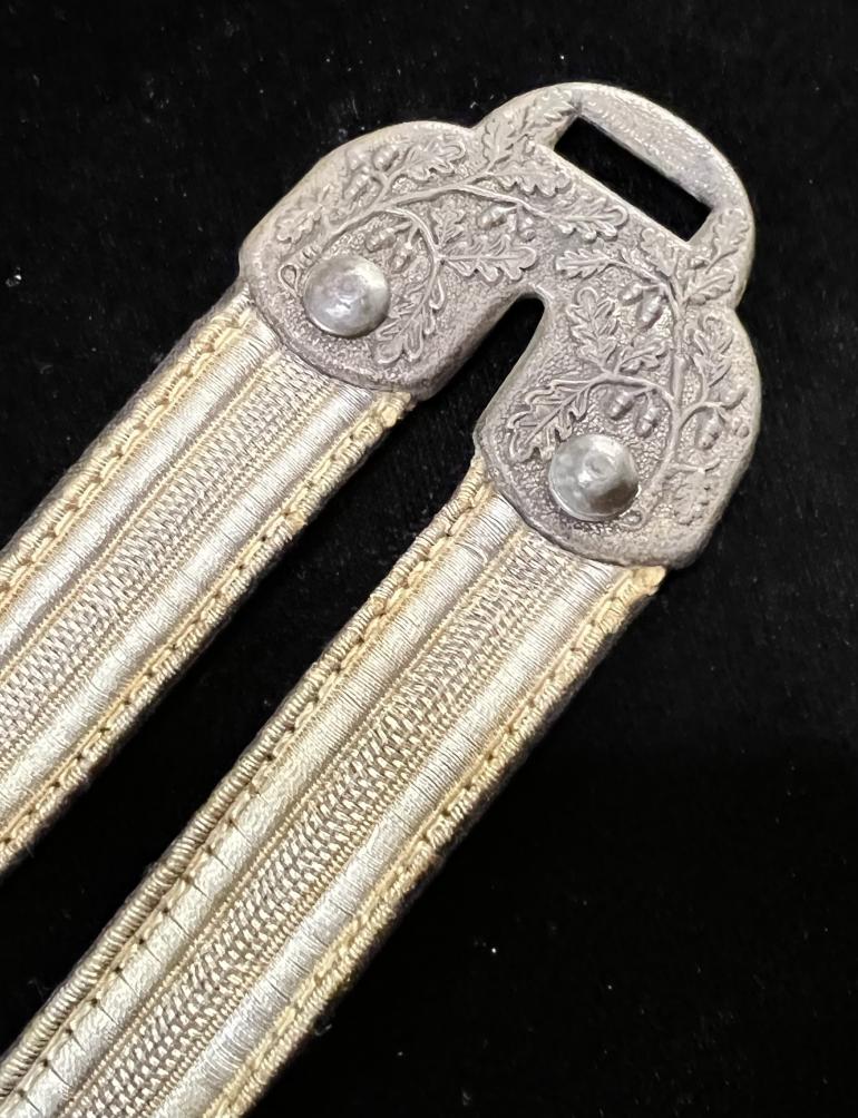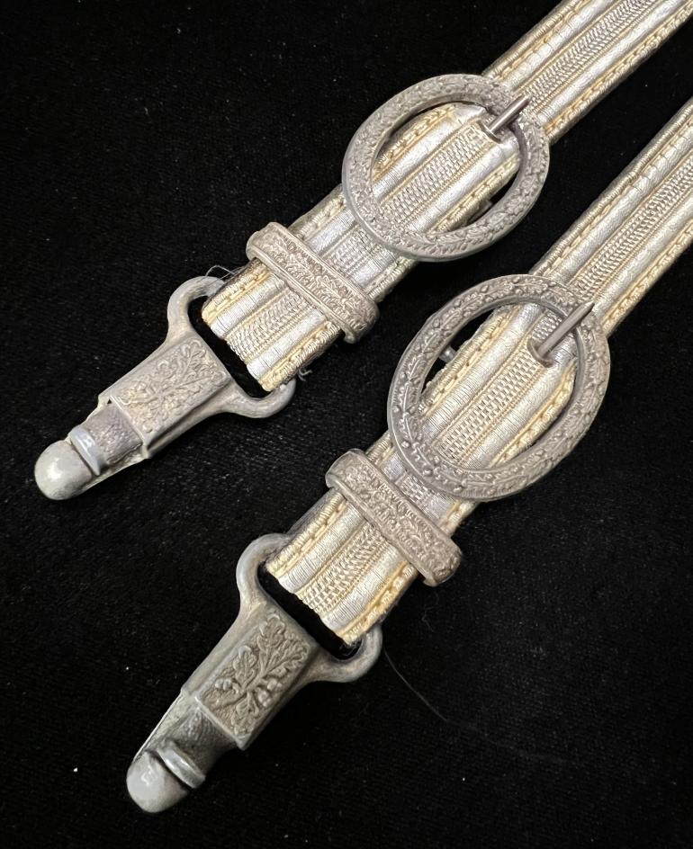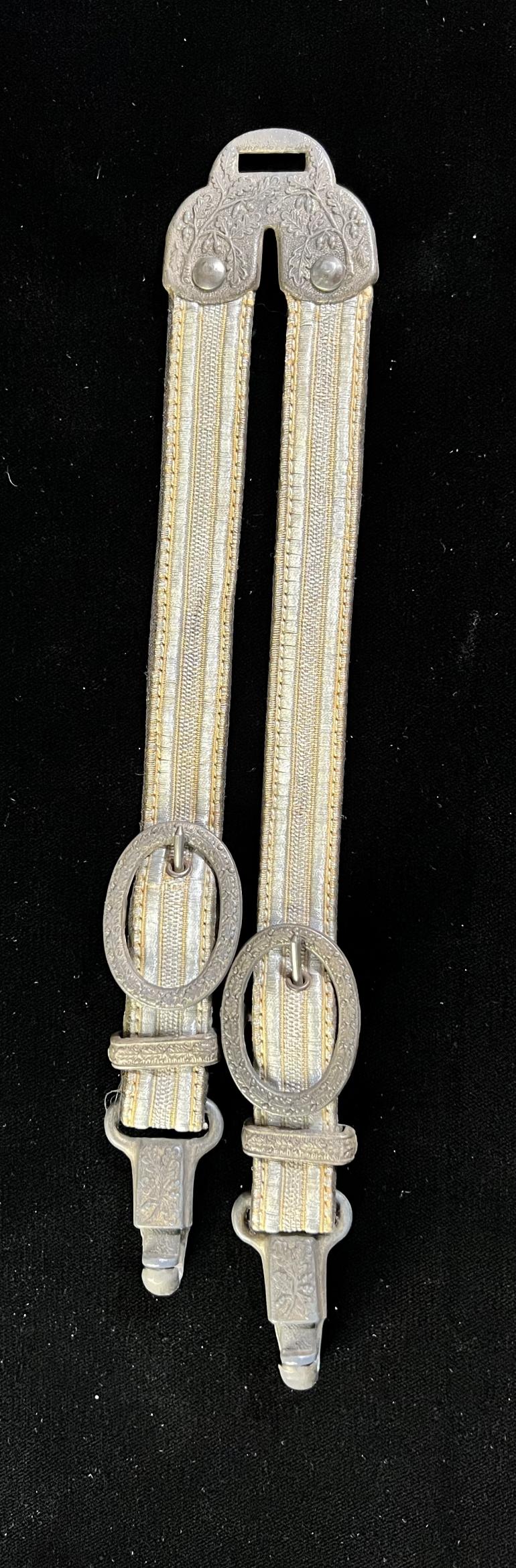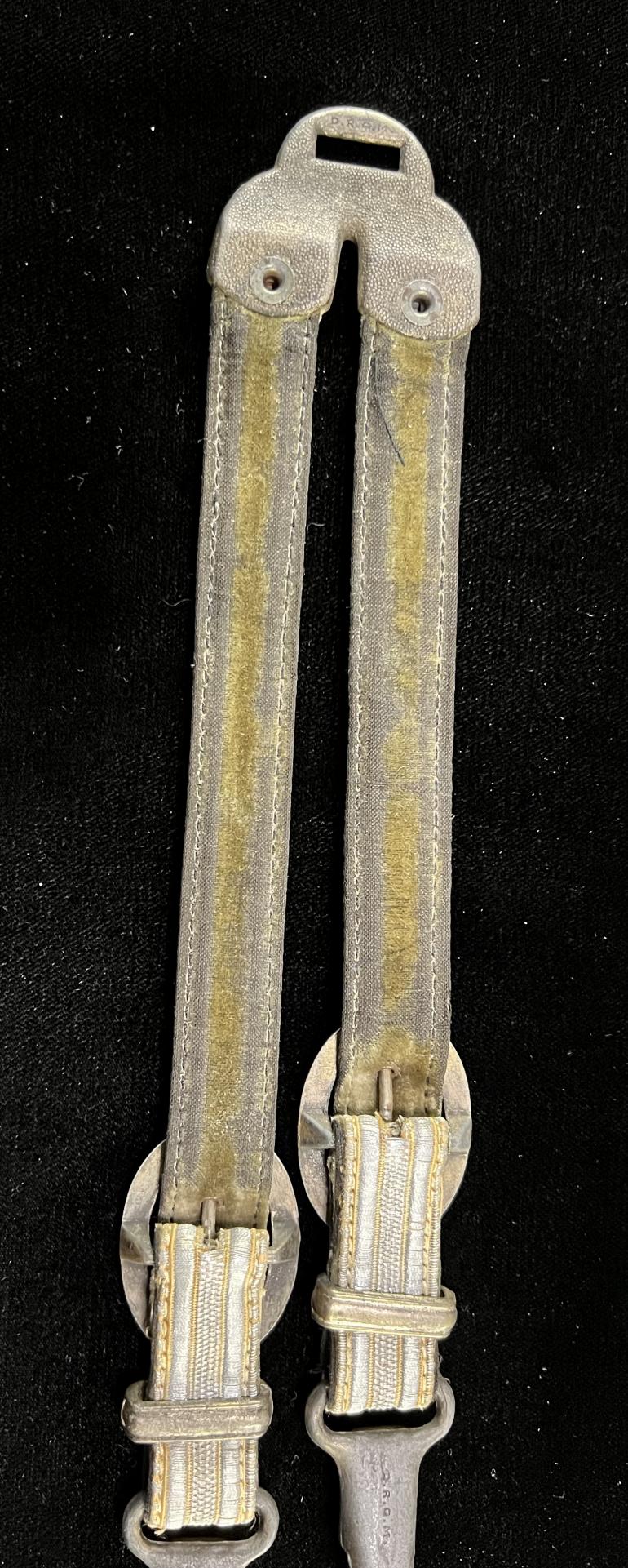 acceptance. The horseshoe upper fitting has the elaborate two branches with the Oak leaves and oak nuts.The straps are riveted to the pristine straps. The lower snap catches are from a 2nd model luft hangers that matches the top upper fitting with the Oak leaf branches. The spring snaps work correctly. The top fitting and snap catches are stamped with the DRGM notation. Just a great set to highlight your best dagger.