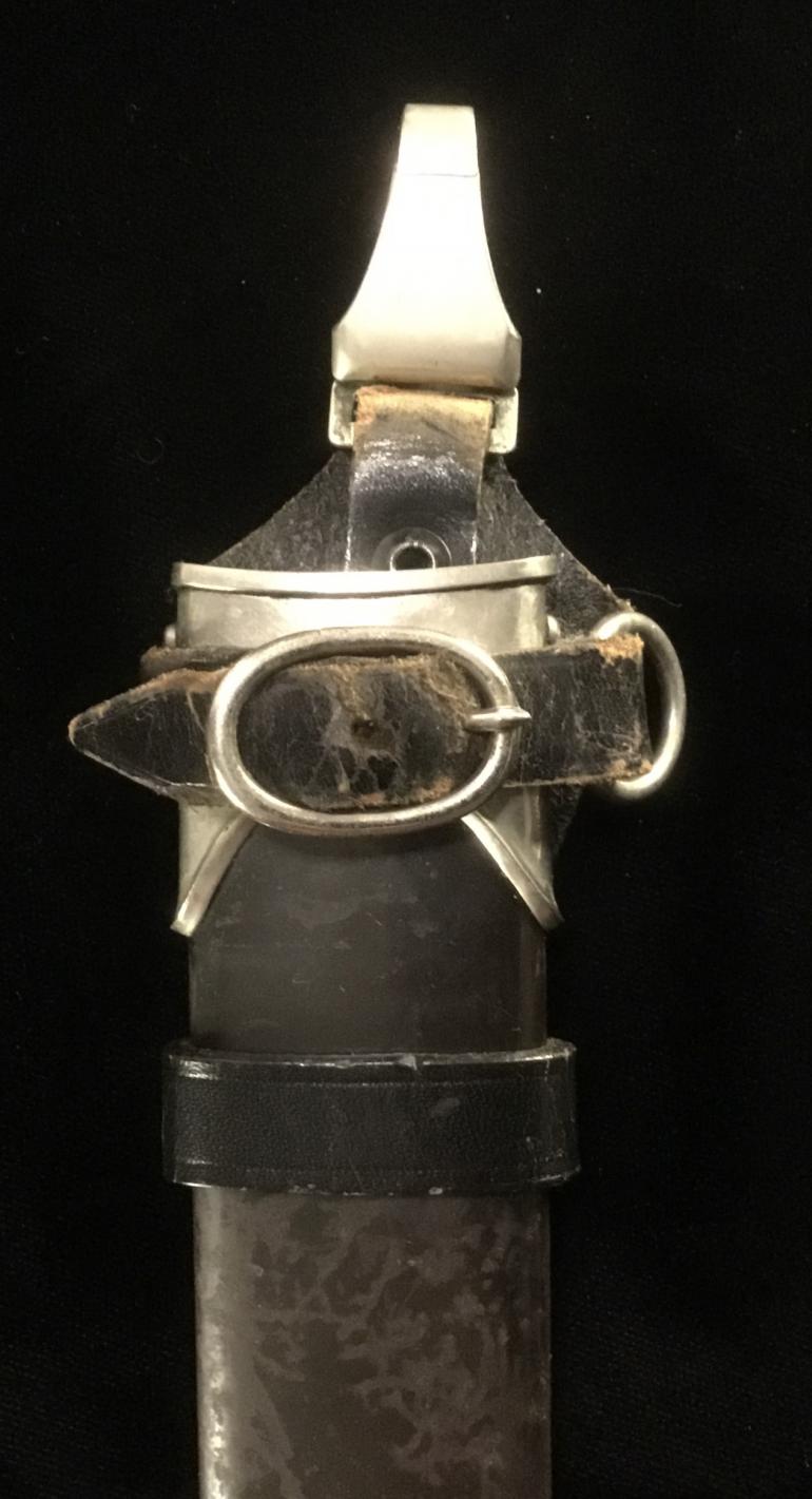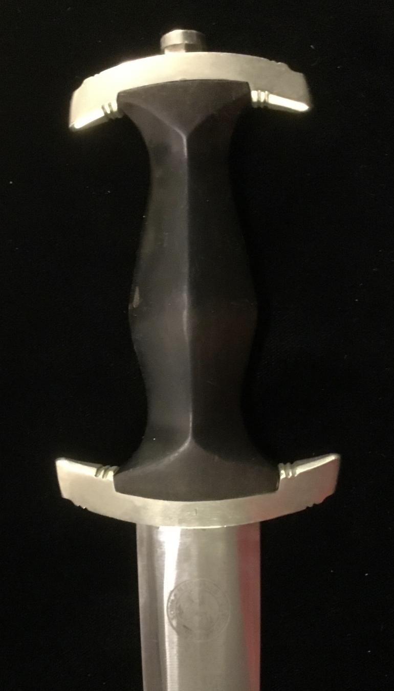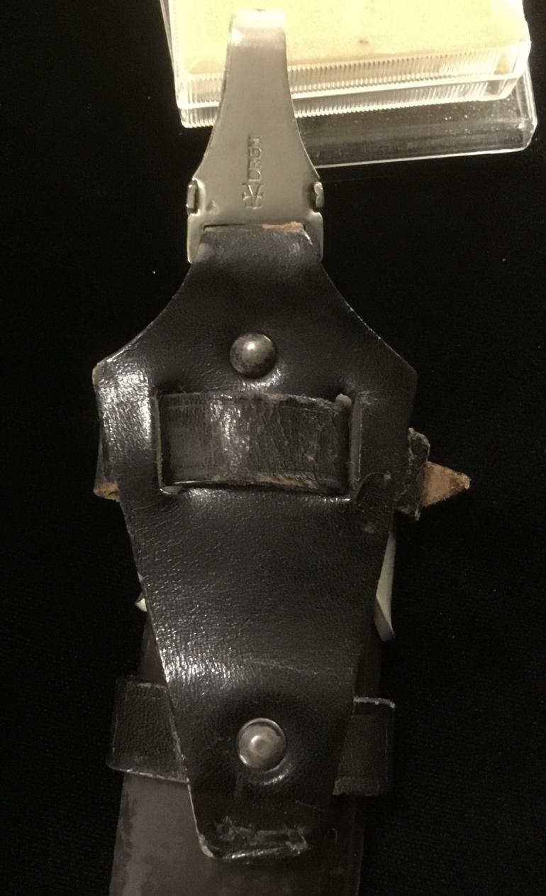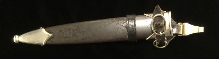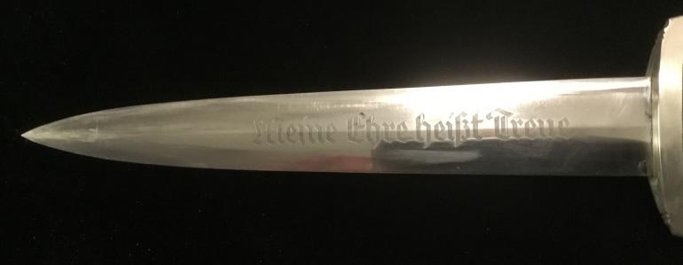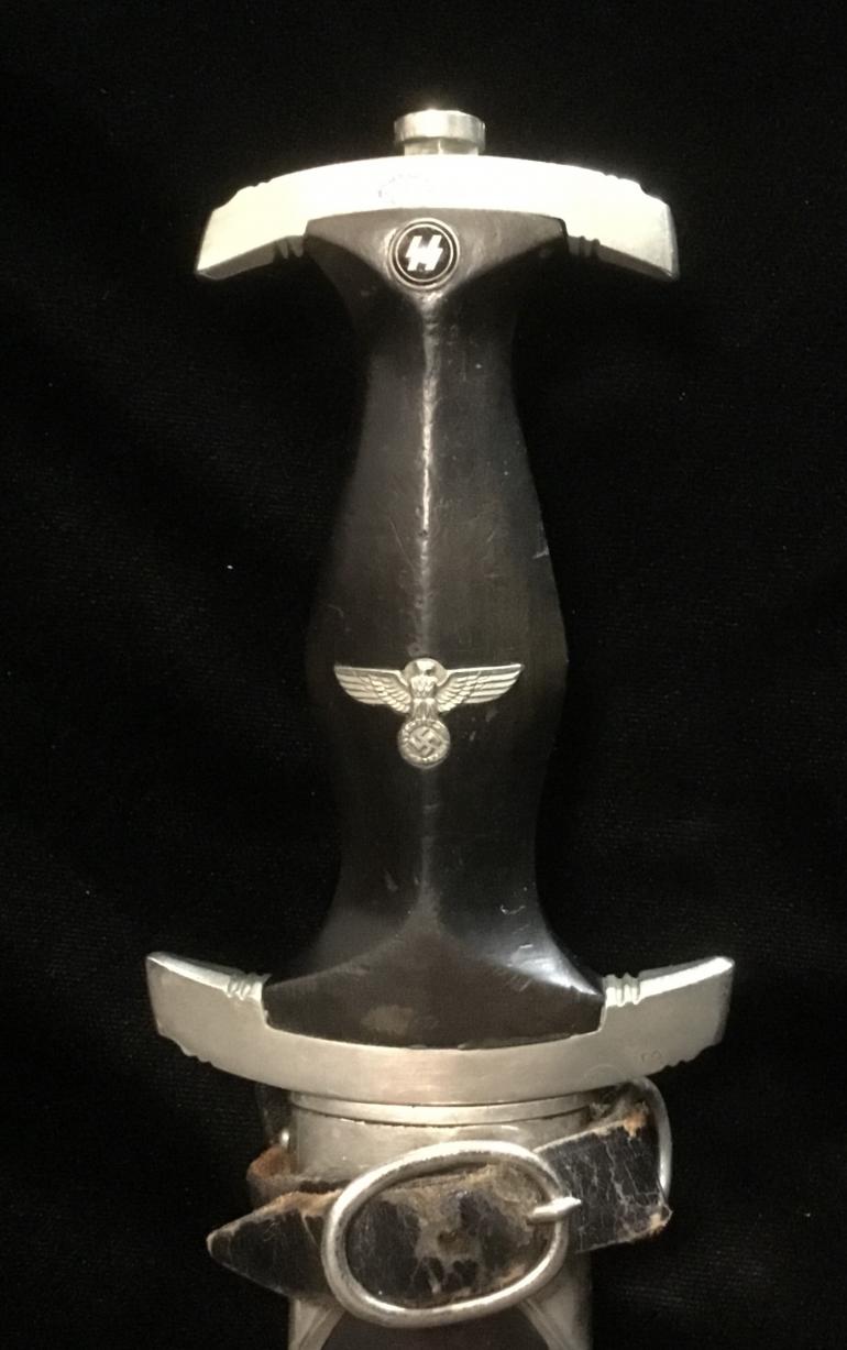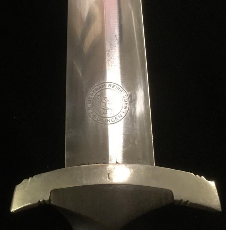 This M34 SS Dagger was made by the highly desirable Bertram Reinh. Sohn Firm. As usual I will start my description with the Grip and Fittings. The nickel-silver finish matches on all knife and scabbard fittings. The Pommel Nut does not show that it has never been removed. The top cross guard has a blemish to the obverse. The lower cross guard has the district 1 stamped into the reverse face. The bottom of the cross guard facing the logo has the numbers 67 684 stamped into it. Now the best part is that the wood grip fits perfectly in the cross guards, no gaps and no shrinkage to the wood at all. This being an early dagger the grip is the thinner style body with the sharp edges, just the way I like them. The eagle and roundel are a perfect fit with no wear on either the eagle or the enamel SS. The blade, the etched Motto is perfect with the nice gray lettering. The reverse side of the blade had the highly collectable factory Bertram Reinh logo of the Rooster and Hen was expertly etched just as the SS motto on the obverse. The blade itself is the full length with no nicks and only one small spot near the lower cross guard. The scabbard is anodized as it should be and comes with a vertical hanger. The body has scratches to the finish with some light rust in that area. The ball is not damaged, it just shows normal wear. The leather hanger is in very good condition with just the loss of the black finish around the top snap catch.