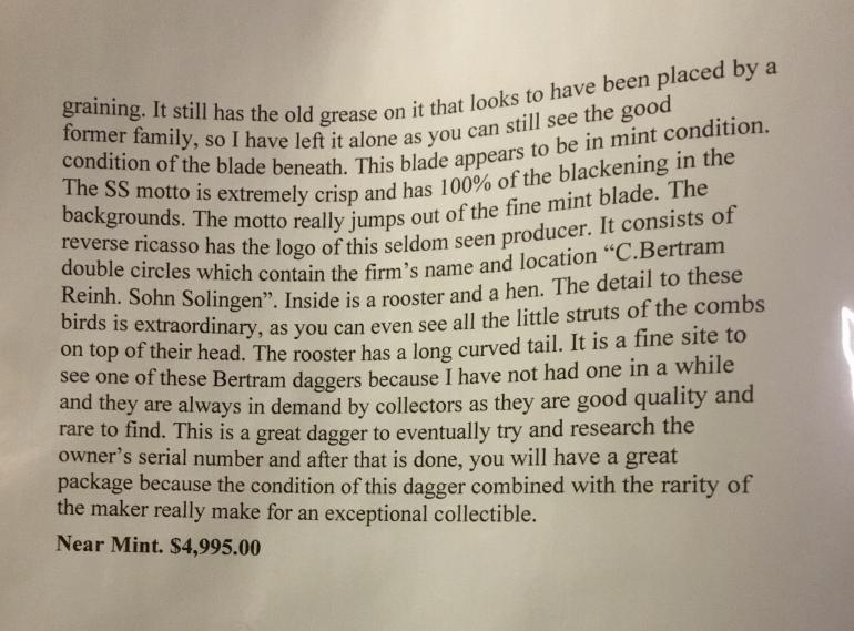 This dagger was sold in 2011 for $5,000.00 by a well know dealer that listed the dagger as near Mint. That is his description not mine. The original sales receipt is included.