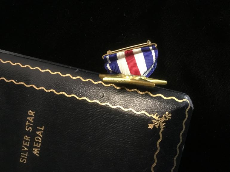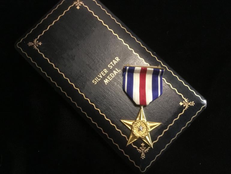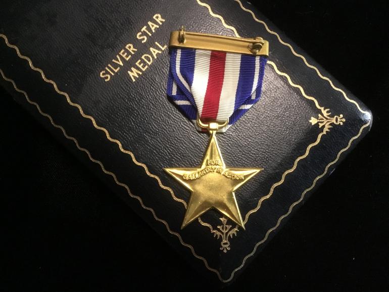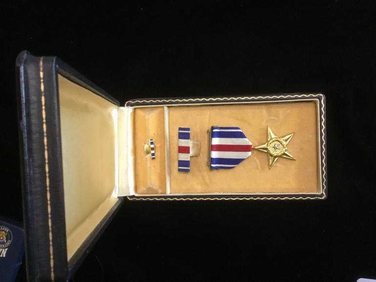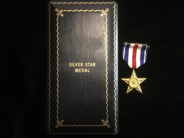 This is a great new old stock cased Silver Star medal. It is in a WWII presentation case with the button hole enamel ribbon bar, the cloth ribbon bar with pin and catch and of course the SS itself. This Star has the full wrapped broach, heavy ribbon, and the star is serial numbered on the left bottom star arm. The number is 110800. Just a minty looking star that must be an early production run.