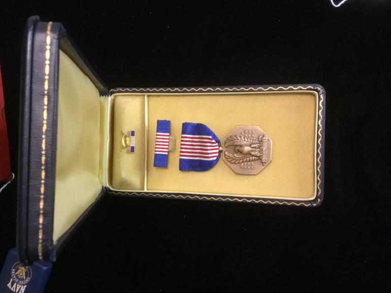 This Soldiers Medal is new old stock cased medal. The presentation case is of WWII vintage and includes the button hole enamel ribbon bar, the cloth ribbon bar with pin and catch. The Soldiers Medal is not serial numbered but has the period slot broach. There are no mfg numbers on the broach or the ribbon bar.