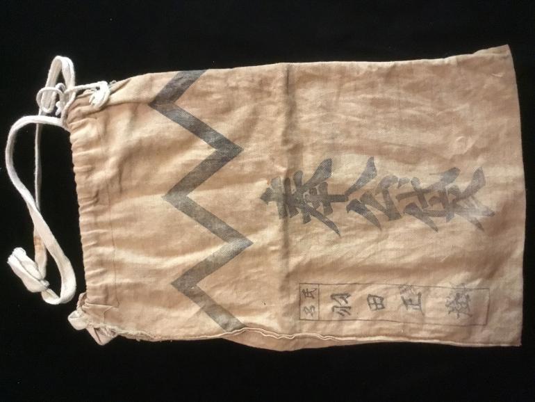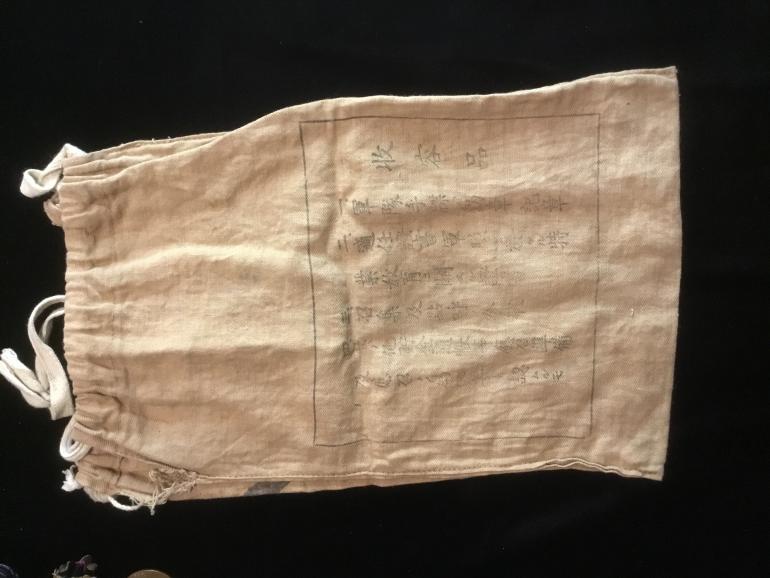This is a Houkou Bukuro (Comfort Bag) gift package sent to a soldier in the army by civilians. I believe all the cloth bags are the same size and have the same writing on both sides. Well they all look alike to me. This is sort of a red cross goodie bag of stuff that they won’t find in the field. Nice for a display with all the writing on it. Size 8” w x 13” H in a brown cloth.