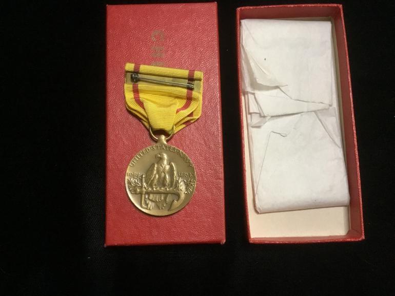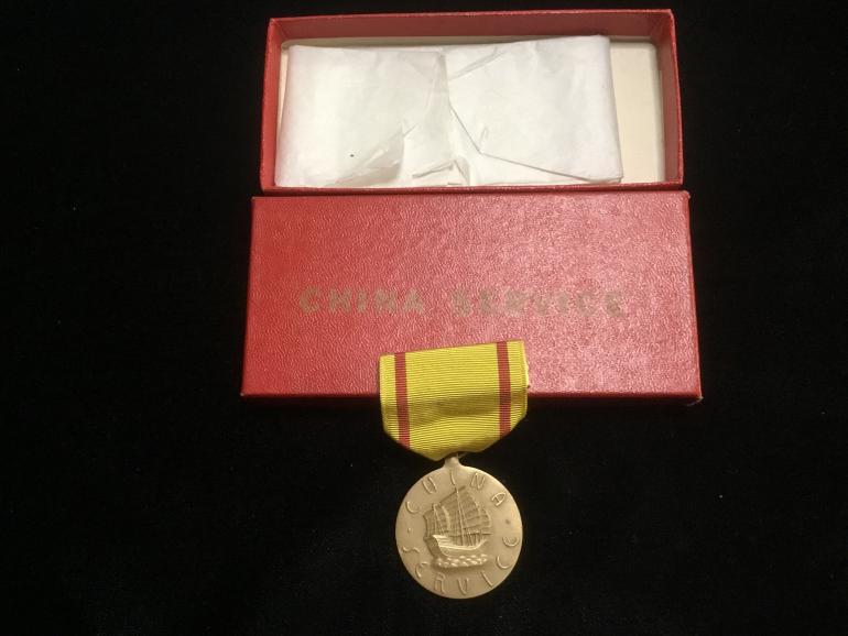 This Navy China Service Medal is a new old stock item. The red case has the title China Service on the top of the cover. The original tissue paper is intact and in the box. The Medal is with an early crimped broach (no mfg. numbers). Again the medal has the heavy ribbon nothing like the stuff they use now.