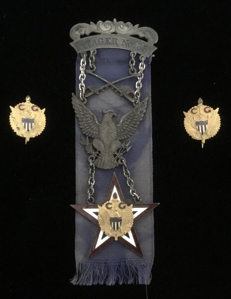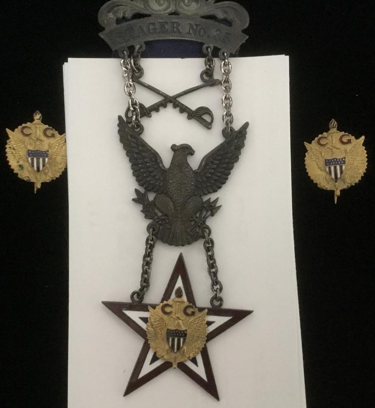 I bought this set a couple of years ago just because the set is so dam nice looking. I honestly have no idea what it represents, a school, military school, fraternal org, who knows. I have spent some spare time looking on the internet with no luck. If you know what this is for please let me know. Maybe if it’s something good I would keep the set. OK the upper bar with Stager no.35 appears to be sterling as the rest of the medal. To start off there is a set of swords hanging by chains with a typical Military eagle hanging on another chain set. Then from the eagle by chains is five pointed enamel star with a raised circular winged eagle with C G above it. Then there are two circular disk with the eagle the same as on the star. In my mind it must have some military connection as the small eagle disk could be collar disk?