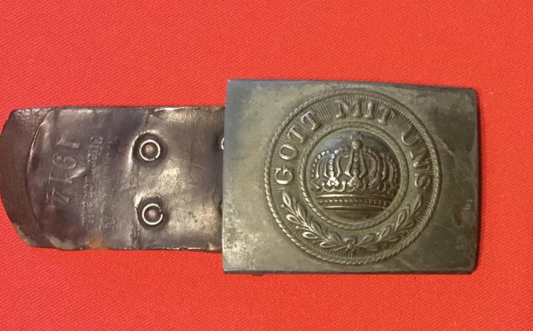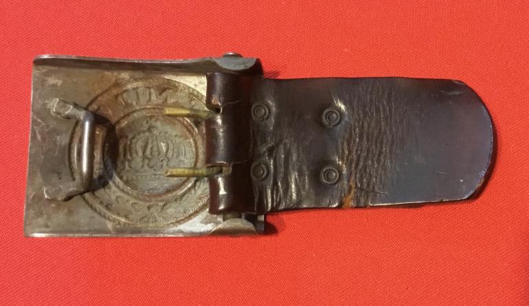 WWI BUCKLE WITH LEATHER TAB DATED 1914