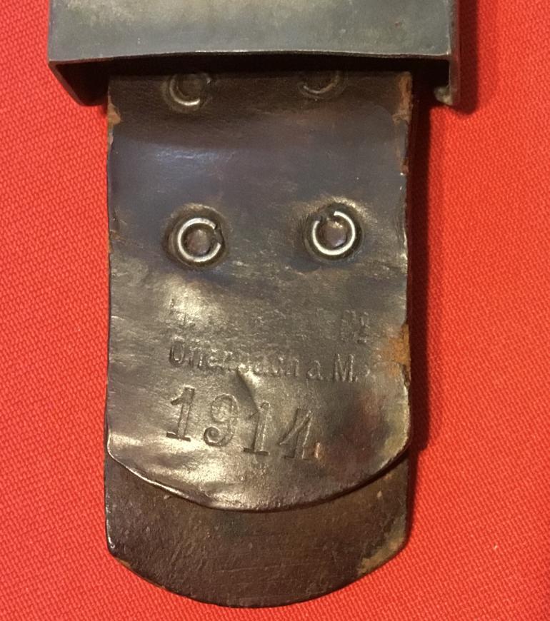 This WWI buckle with leather tag has a gray green paint on 80% of the steel buckle. The buckle has a unusual catch that is mounted towards the middle of the buckle. The leather tab is marked 1914 the makers name can not read and Offenbach a M. The leather tab is held by four rivets. Condition very good