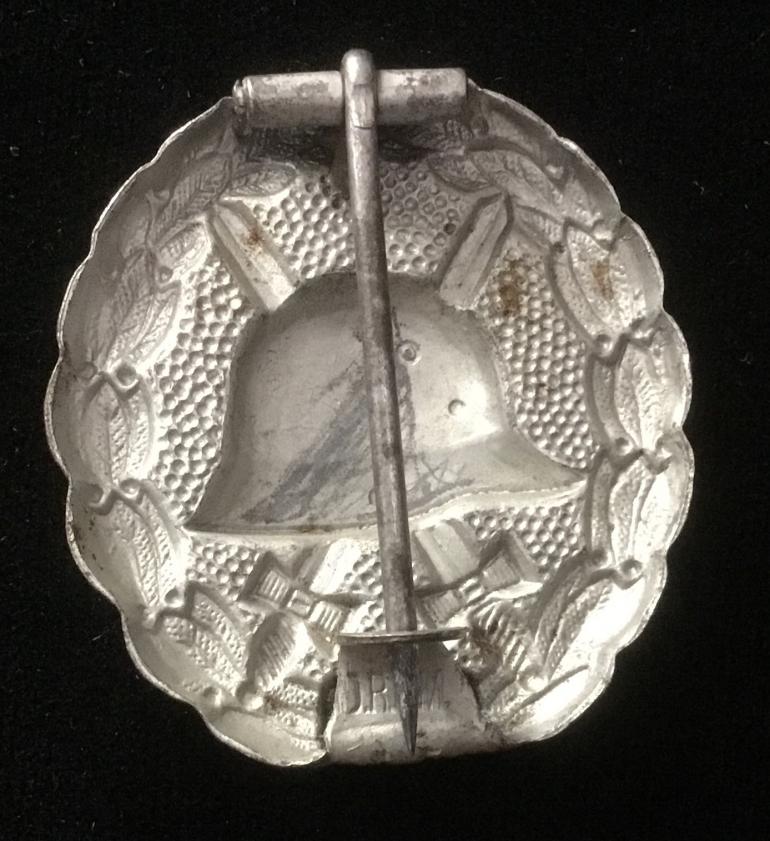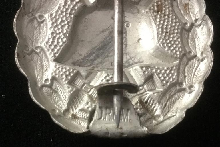 This Silver Wound Badge is an early mfg. the catch is a part of the original stamping that is bent and shaped as a hook. On the flat section it is stamped DRGM. The badge shows wear. Condition very good ++