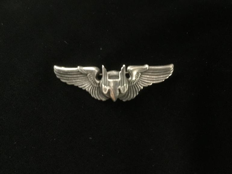 This 3" Gunners Wing is made of Sterling and has a pin back attachment. The safety lever is missing from the catch. The Wings have been bent back to give the center Gunners insignia a protruding place and really catches the eye.