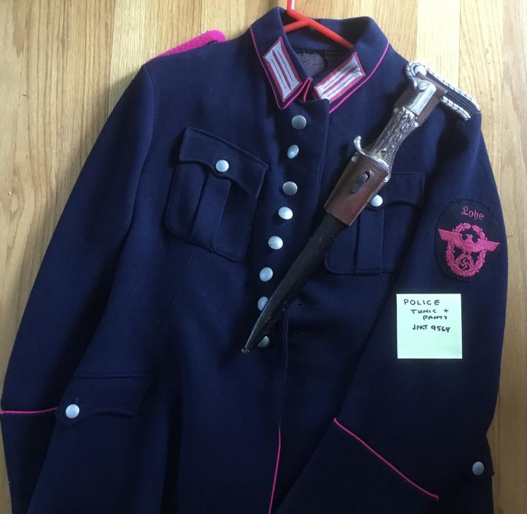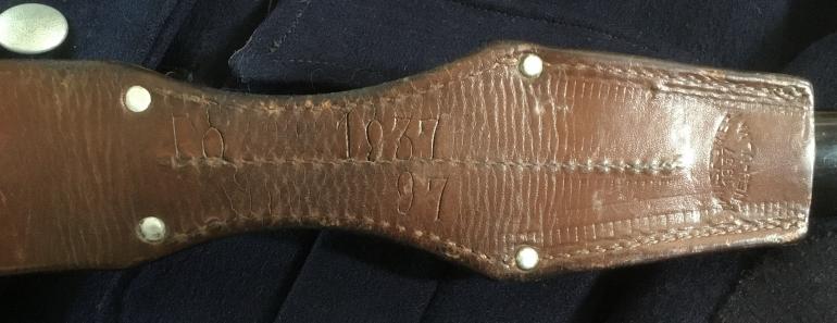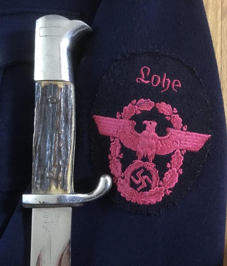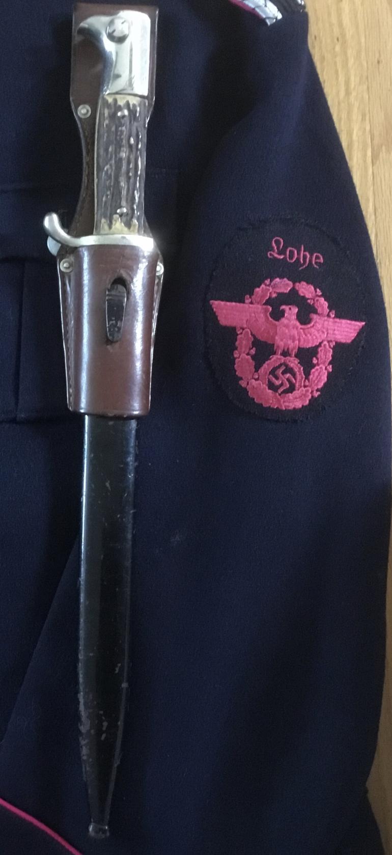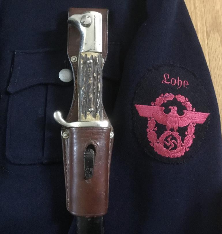 This Police Dress Bayonet is just a nice complete set that included the dress bayonet, stag grips bright blade and a great named brown frog. This bayonet was made x ALCOSO A C SOLINGEN that is etched into the reverse of the blade. The pommel,back-strap and cross guard are one casting with the nickel steel look. The birds head Pommel is slotted for mounting on a rifle with the push button actively working, the grips are stag horn that have a great look to them. The blade is chrome plated, with a blood grove and false upper leading edge. The brown buffer leather washer is present. The blade is super clean with no nicks or rust. The black scabbard shows some use, the paint has the spider webbing in the paint. The brown frog is also in great shape with the four rivet construction. Between the reverse side of the rivets the following is stamped Po 1937 and under the date it is stamped 97. The factory name is stamped on the lower portion reading Hansromer 1937 NEU-ULM.