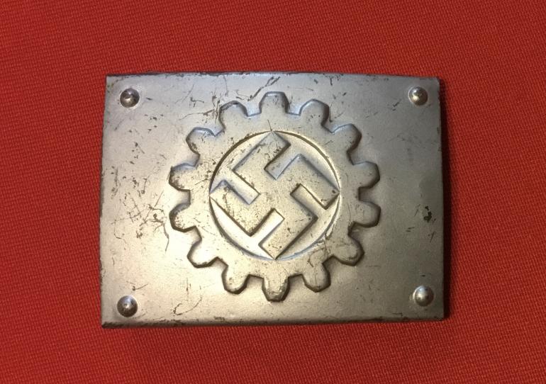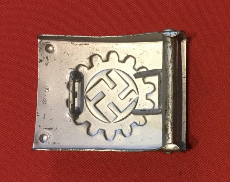 This aluminum die struck buckle shows little or no use just storage knocks. The reverse is marked with Assmann & Sohne figure and A&S. This buckle must have been made before the RZM numbering system was in effect. Condition very good+