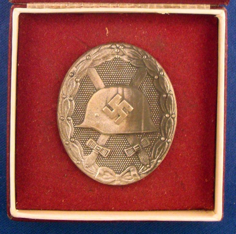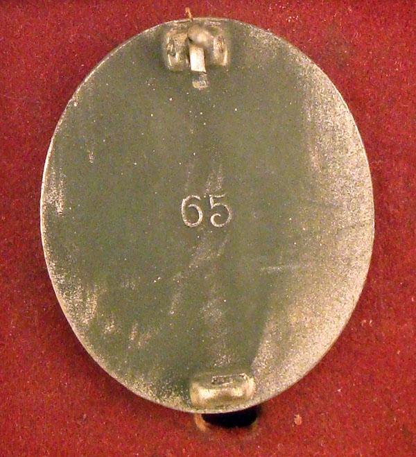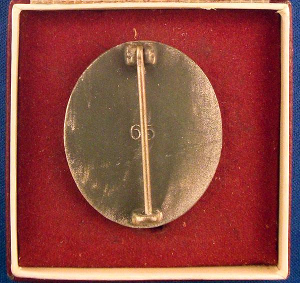 This has been kicking around my place for a while so its time to sell it. This no 65 Klein & Quenzer A.G.. is made by a die struck of a zinc-alloy base that has been silver washed. The silver wash has deteriorated on the right side most likely because of the low quality of the medal material. The reverse has the nice clear raised 65 under the pin. The wound badge is in the original box that it came when I bought it. The front vertical piece of the box is missing and there are no maker marks on the box. Condition good +++