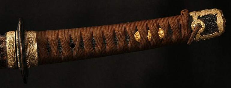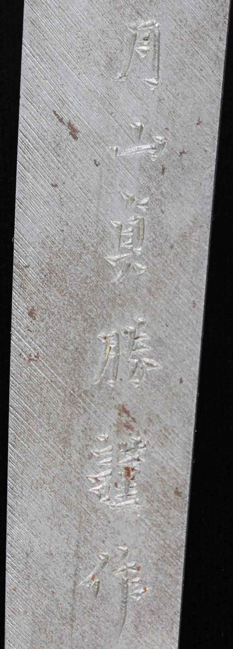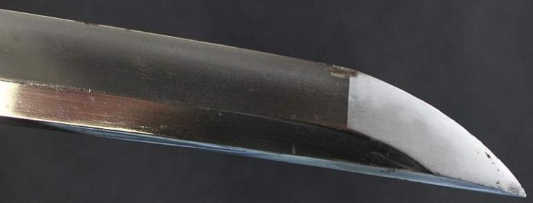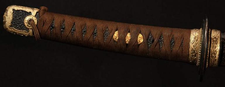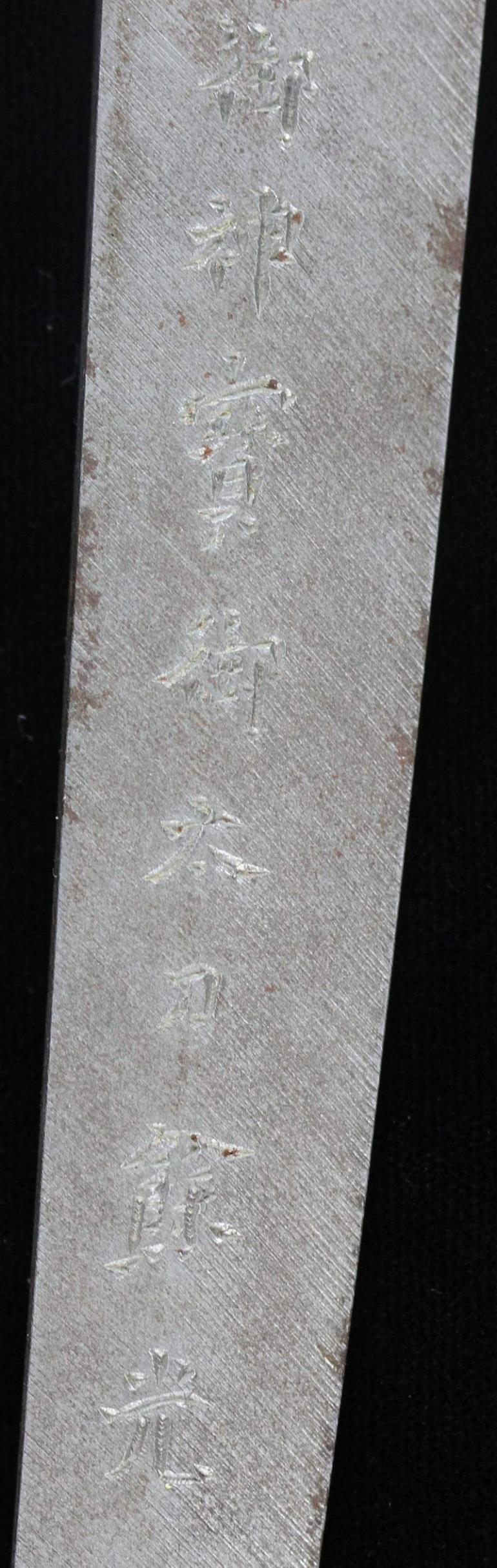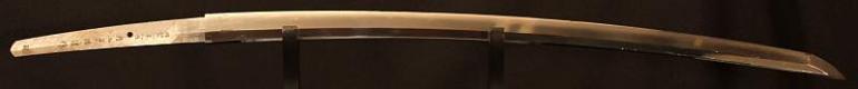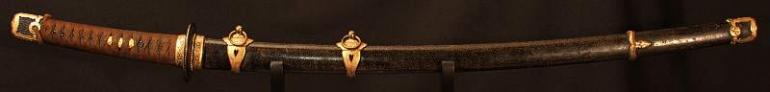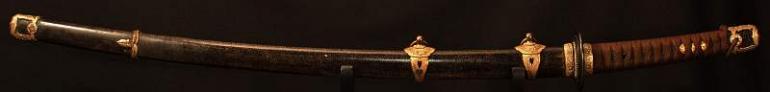 This blade is signed Showa ju hachi-nen Gassan SadaKatsu Kinsaku with the Kao which means Showa the 18th year, humbly made by Gassan SadaKatsu with his crest. The other side reads: Sumiyoshi Okami Go-shin no Takara O-tachi Yokp which means Great God Sumiyoshi, honored God's treasure the honored sword remaining light. I think this and another sword were made for the Sumiyoshi shrine making this a shrine sword? Or perhaps it came out of one, I guess that is speculation but there is another near identical sword tot his one out there so I doubt they were made for a person, still, this one has naval mounts so if you know the answer please let me know. This blade measures 26 3/4 inches in length which is actually longer then typical for a naval sword, naval blades are normally a bit short. It is really nice to see mitsu-mune on this one and as so often itame hada. The temper is a nice gunome-midare with a lot of wonderful activity. The blade is spectacular, slightly hazy of polish but you can still see everything pretty well. The boshi is wonderful and trust me, you will be impressed! I did bring this sword to a show a few years back and showed it to a couple of collectors, it was a show stopper! This blade was made in 1943 very shortly before he died, I think it may have been made for a shrine also, so you can imagine he would never insult the Gods. This blade is spectacular, sorry to be repetitive but it is! The habaki is silver foil and of the moss pattern as we expect to see on Gassan blades. The naval mounts are in pretty good condition, the says has shark skin lacquered over which looks nice with very nice quality and conditioned fittings. The tsuka is in fine condition also and has a black lacquered same under the tsuka-ito. Super nice menuki with typical but high quality fuchi and kashira. The tsuba is typical with the dai-seppa but they are a little different, engraved on each side it reads "Gunto Hokoku dai yon ni roku-go" which means "Patriotic Military Sword 426" If anyone knows what this represents I would love to know!