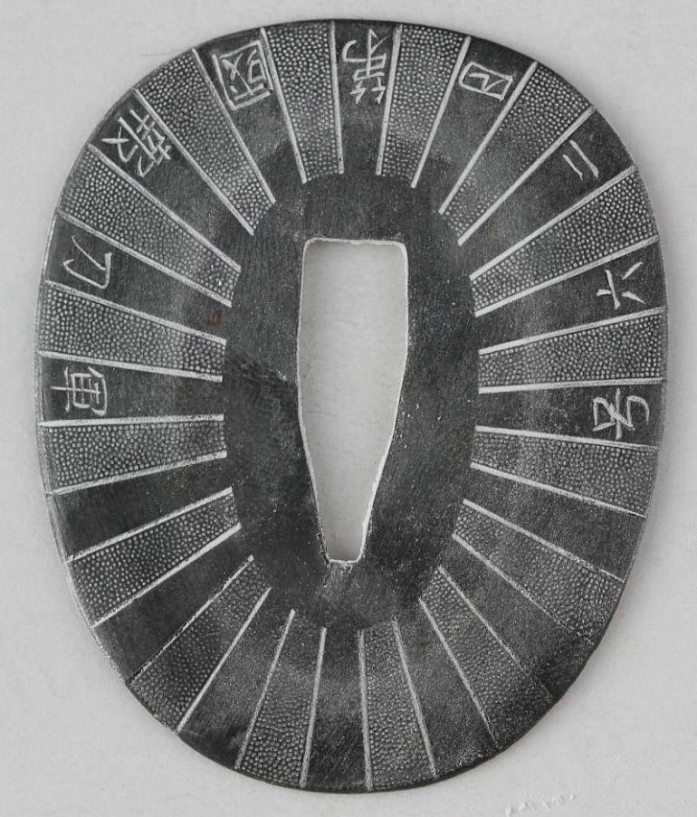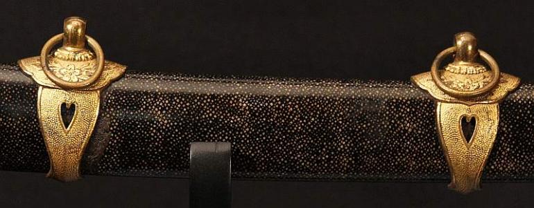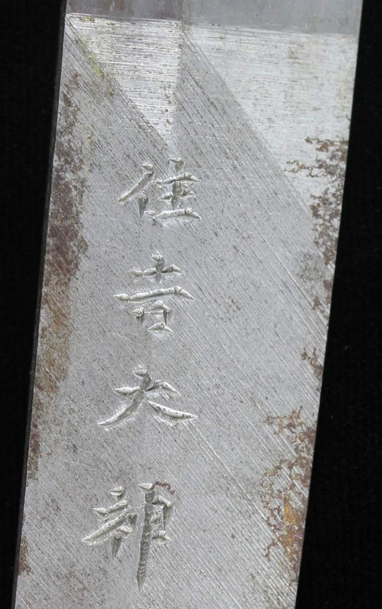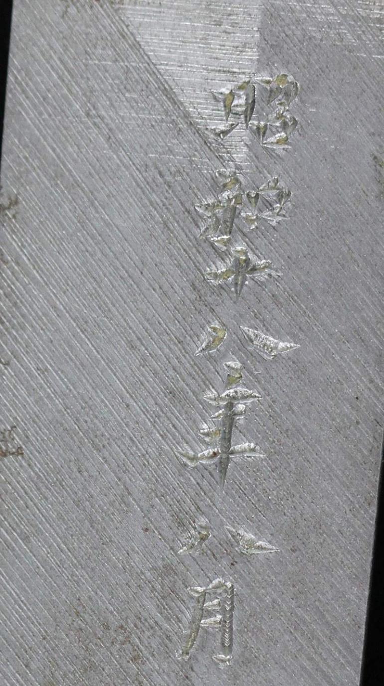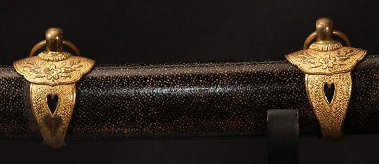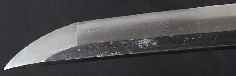 This blade is signed Showa ju hachi-nen Gassan SadaKatsu Kinsaku with the Kao which means Showa the 18th year, humbly made by Gassan SadaKatsu with his crest. The other side reads: Sumiyoshi Okami Go-shin no Takara O-tachi Yokp which means Great God Sumiyoshi, honored God's treasure the honored sword remaining light. I think this and another sword were made for the Sumiyoshi shrine making this a shrine sword? Or perhaps it came out of one, I guess that is speculation but there is another near identical sword tot his one out there so I doubt they were made for a person, still, this one has naval mounts so if you know the answer please let me know. This blade measures 26 3/4 inches in length which is actually longer then typical for a naval sword, naval blades are normally a bit short. It is really nice to see mitsu-mune on this one and as so often itame hada. The temper is a nice gunome-midare with a lot of wonderful activity. The blade is spectacular, slightly hazy of polish but you can still see everything pretty well. The boshi is wonderful and trust me, you will be impressed! I did bring this sword to a show a few years back and showed it to a couple of collectors, it was a show stopper! This blade was made in 1943 very shortly before he died, I think it may have been made for a shrine also, so you can imagine he would never insult the Gods. This blade is spectacular, sorry to be repetitive but it is! The habaki is silver foil and of the moss pattern as we expect to see on Gassan blades. The naval mounts are in pretty good condition, the says has shark skin lacquered over which looks nice with very nice quality and conditioned fittings. The tsuka is in fine condition also and has a black lacquered same under the tsuka-ito. Super nice menuki with typical but high quality fuchi and kashira. The tsuba is typical with the dai-seppa but they are a little different, engraved on each side it reads "Gunto Hokoku dai yon ni roku-go" which means "Patriotic Military Sword 426" If anyone knows what this represents I would love to know!