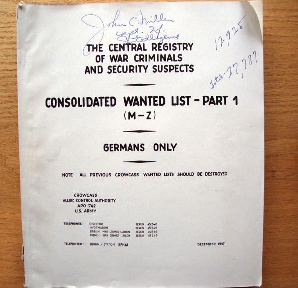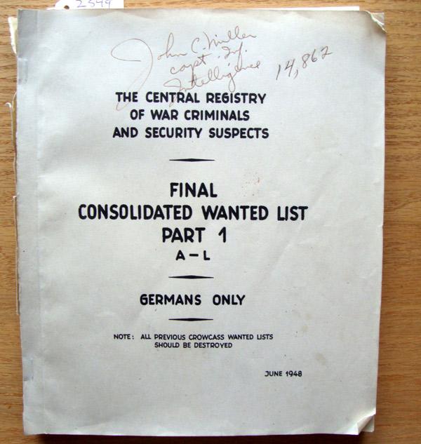 This two book set listing of the Central Registry of German War Criminals and Security Suspects is dated June 1946. The cover also list that this is the Final Copy and that all previous copies are to be destroyed. This paper back set list over 28,000 wanted German suspects for various crimes including Murder, Pillaging, Rape, Terrorism, etc. The two books are divided with names from A to L in the first book and M to Z in the second book. The books list the Names, Rank, Branch of Service and in some cases the area of the crime of each individual. Again this is something that I have never seen before and I consider them to be a rare collectible form WWII. Condition rare good +++