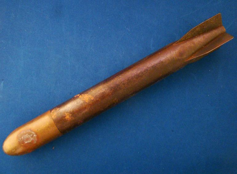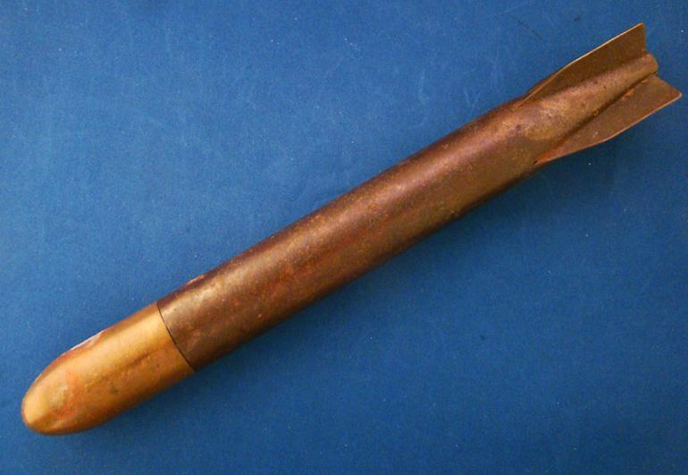 I have always had a weakness for desk ornament and this is one I had with my submarine ornaments on the right of my large desk. This torpedo is 12 1/4" long and 4 1/4" in circumference. Its made of steel body and the warhead is made out of brass. It is a professional job and fins are in slots in the torpedo body. The torpedo has to weight at lest three pounds as its all solid material. Don't know who made it no marks at all on it. Really the neatest submarine item i have had. The body shows rust in several spots on the steel body and some corrosion on the brass warhead. Condition good +
