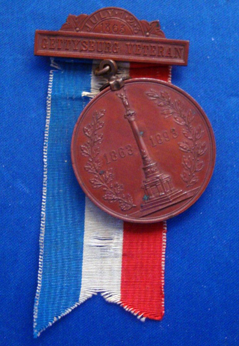 This N Y State 30 year medal for the 1893 monument gathering is complete with the original ribbon. For every 40 similar medals I have seen only about 5 have the ribbon. This medal is one of the best quality medals for any Gettysburg reunions that I have seen the medal itself is very thick and the NYS emblem is stuck with coin like quality as is the statue on the reverse. The date July 1 2 3, 1863 is on the fasting bar to note the battle dates. I guess you can tell i am bias thwords this medal as I have about 8 of them in my collection. Condition very good+++
