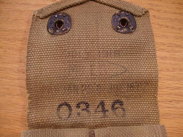 This came to me years ago in a WWI foot locker full of uniforms. This Mills Belt in in great shape with the original color to the canvas and includes a 45 clip holder dated July 1918 with the dot snaps. the first aid pouch is dated on the reverse but not readable by me. The belt is unused and the clip and first aid pouch are used. Condition very good