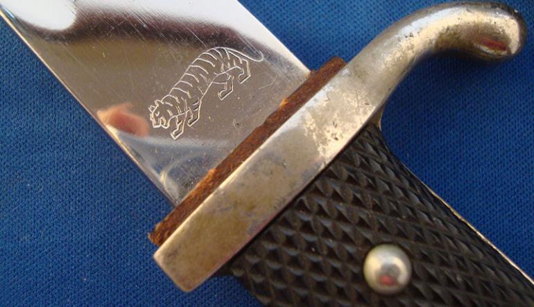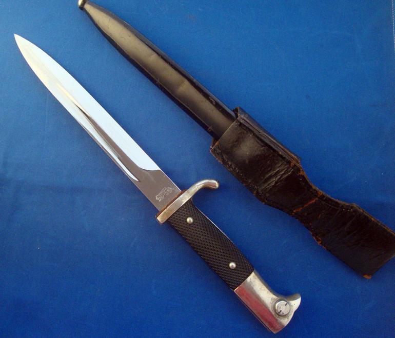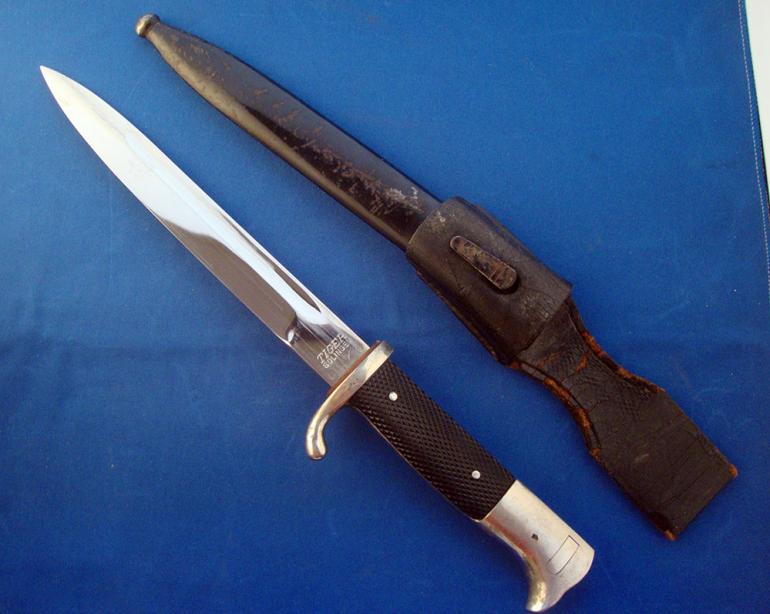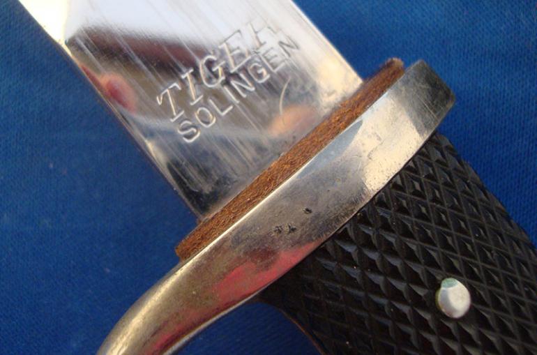 For all you Tiger Collectors here is a nicely double marked Tiger short dress bayonet. This bayonet has the early birds head pommel and did have a working push button clip. The blade retains it great chromed finish with the two maker marks in great condition. There are the typical runner marks on the blade near the point. The scabbard has some paint loss and a small dent on the reverse. The original hanger to the bayonet is in fair condition but it came with it so I left it on. Condition good +