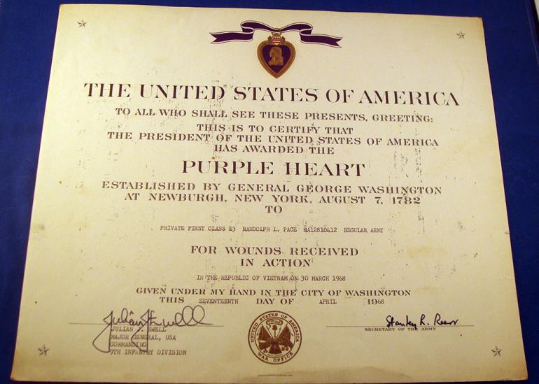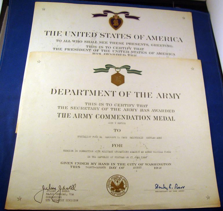 I have had these documents for a long time don't remember where or when I got them. The Purple Heart for wounds was awarded to PFC. Randolph L. Pace for action on March 30th, 1968. The Army Commendation Medal with V device was issued to Specialist 4th Randolph L. Pace on June 27, 1968. Both documents are full size and soiled. I think they could be cleaned to some extent. The documents were in the plastic 9th Infantry Division award cover. Condition good