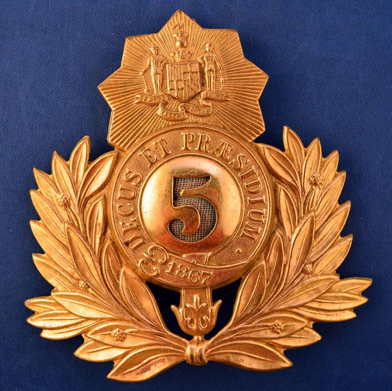 This Maryland State Guard Shako Plate was used between 1870 and 1880. The plate measures 4 1/4" high and 4 3/8" wide. It has the state seal on top in a lined sunburst and the punched out 5 for the fifth regiment has a cloth backing applied. All the fastening loops are still there already to be used to complete your helmet. Condition very good to excellent
