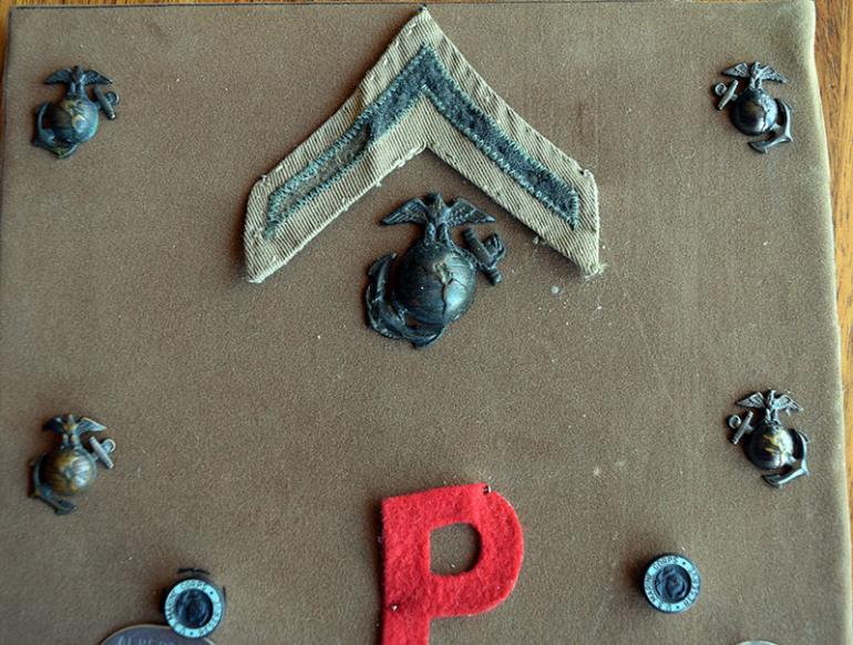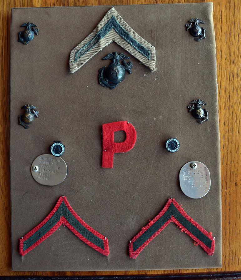 This is a nice identified group to Pvt. Donald E. Albertson with two dog tags named to him and listing his service no. 577002 Protestant religion tetanus shot 7/45 Type B blood USMCR. The cap and uniform EGA's are screw back with the stylized screw plate on most of the EGA's. The felt letter P is something new to me any help out there? Condition very good