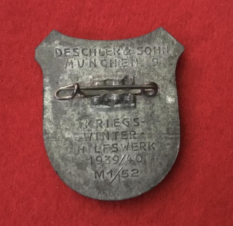 This rare WHW pin was purchased from a veteran who swore that this Winter Relief pin was purchased by Adolf himself when he was in town getting his Hot Fudge Sundae's at the corner friendly's. You can tell he was proud of it because it shows a lot of wear. Guess it looked good with his EK 1. Anyways its a neat WHW pin well marked rather too well marked how many had the M1/52 mfg on the back with the date of the pin. Condition proudly used