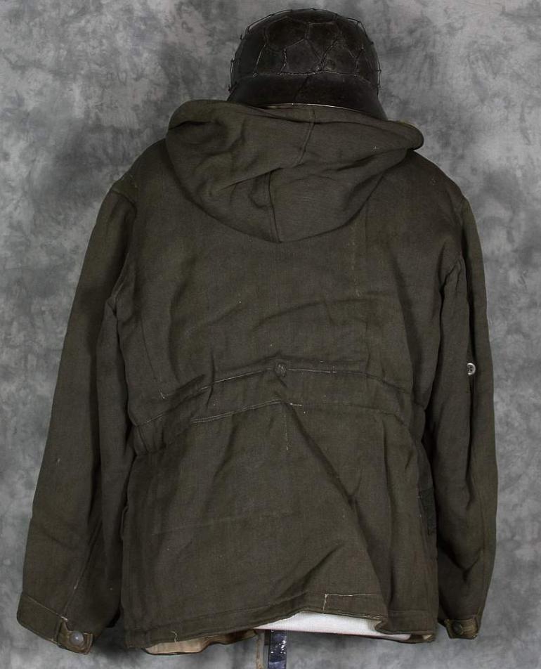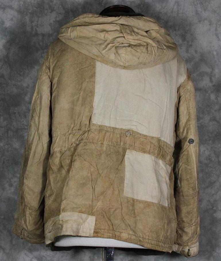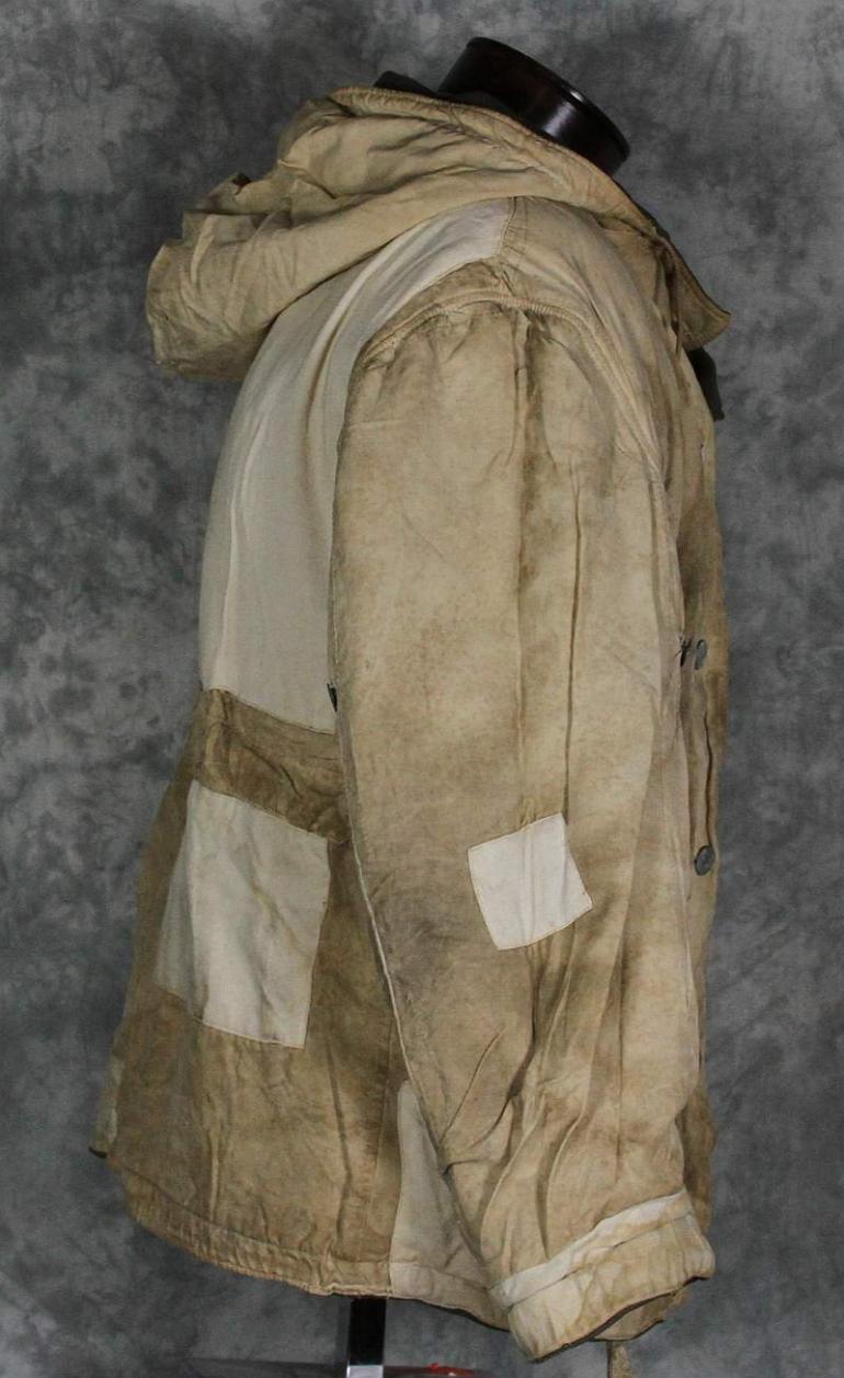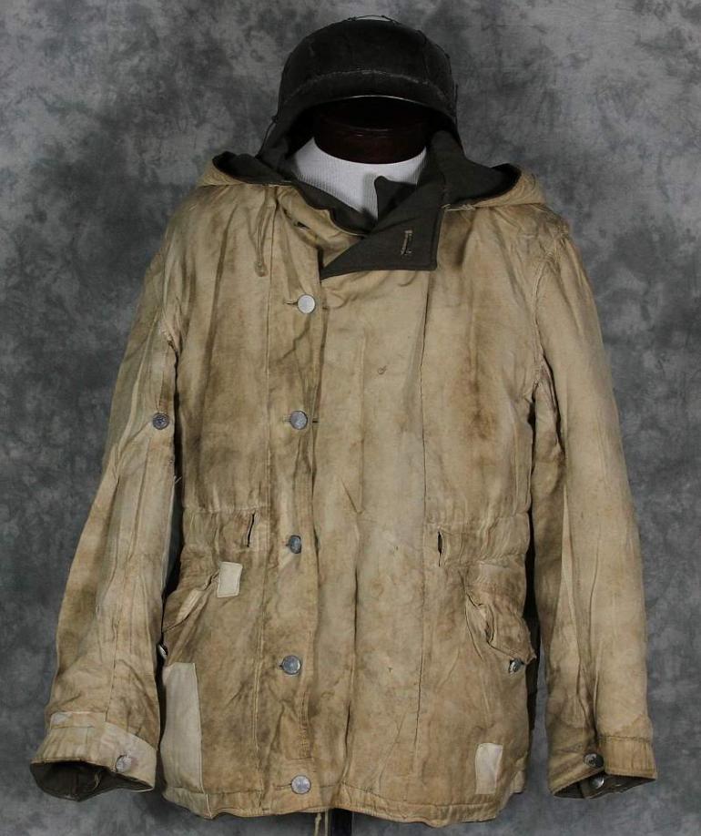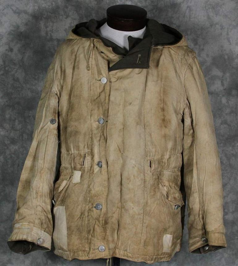 The gray side of this parka looks really nice and only has a couple of repairs, it is very common to see these repaired. I suspect several I have seen were reprocessed after the former owner had fallen. I know the German culture is very frugal and from the damage and repairs I have seen I am sure that is the case. The white side shows many repairs, I have no idea when hey were done, possibly period but are different then I normally see. Otherwise the white side is nice and dirty which looks great! Perhaps not to your wife but to a collector, we love it! This coat will need to be aired out, it has a heavy smell of moth balls.