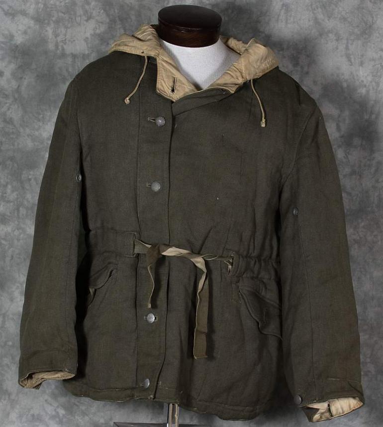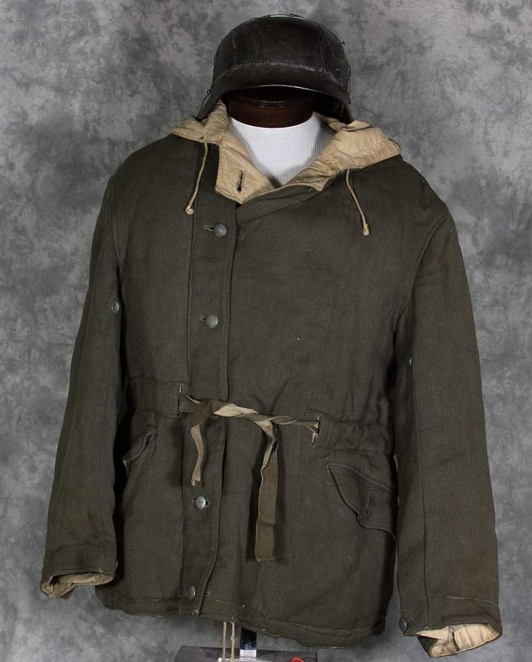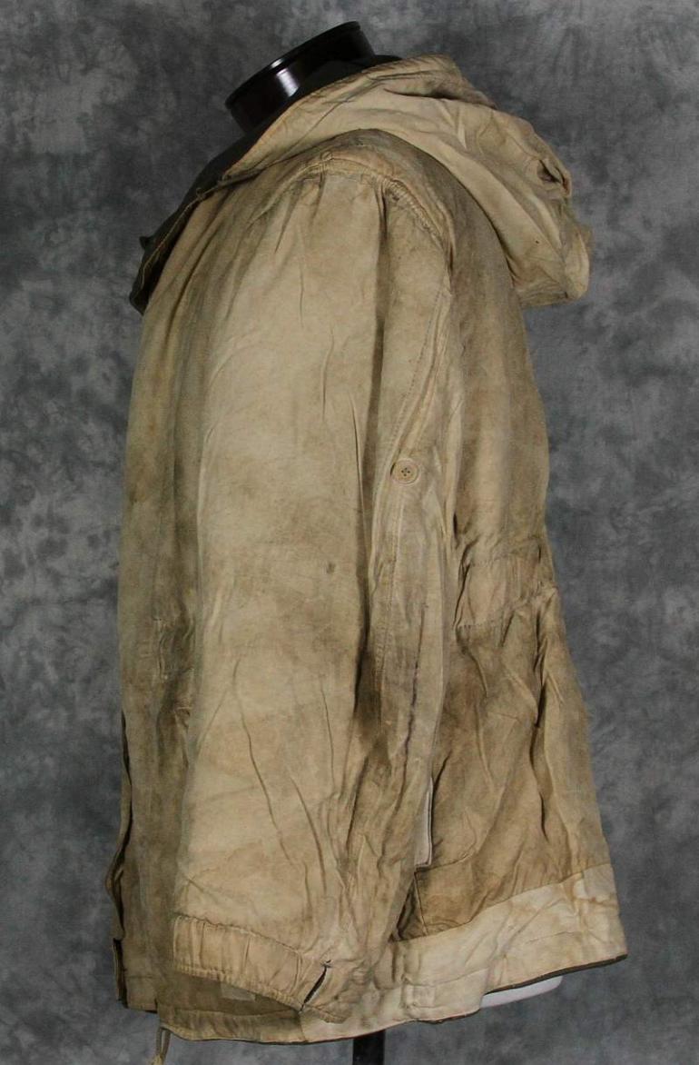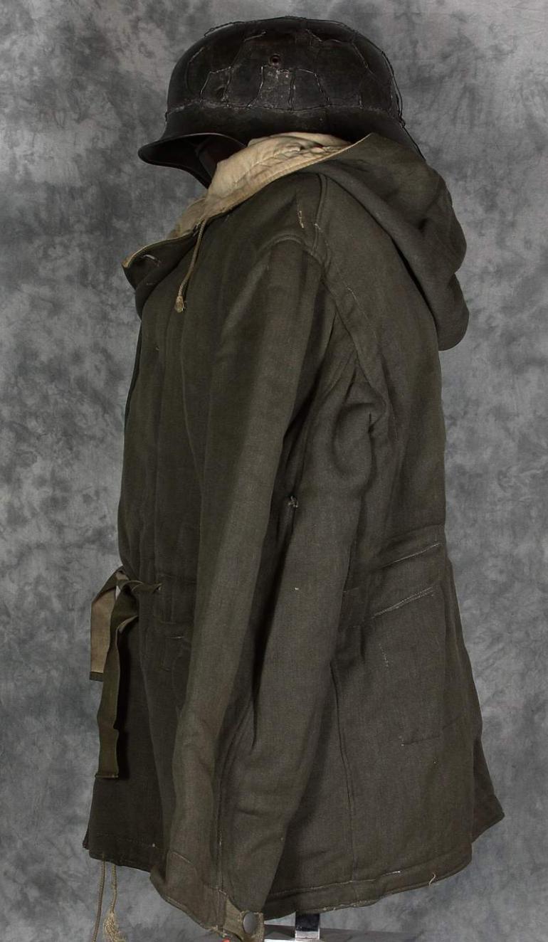 The gray side of this parka looks really nice and only has a couple of repairs, it is very common to see these repaired. I suspect several I have seen were reprocessed after the former owner had fallen. I know the German culture is very frugal and from the damage and repairs I have seen I am sure that is the case. The white side shows many repairs, I have no idea when hey were done, possibly period but are different then I normally see. Otherwise the white side is nice and dirty which looks great! Perhaps not to your wife but to a collector, we love it! This coat will need to be aired out, it has a heavy smell of moth balls.