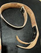 This 37” long Black Leather Belt has an Aluminum Catch and is complete with the auxiliary leather tab to adjust the placement on the buckle. The belt is solid in construction and could be used today the leather shows a lot of cracking on the outside and requires some work to bring it back. Condit ...Read and See More