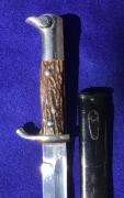 This is a typical dress bayonet by E. Pack & Sons Solingen for an Artillery man with the red insert in the bayonet slot. The pommel, cross guard are one piece in a deep plated finish. The button and release button are functional. The stag horn grips are held on the bayonet with the typical Pack offs ...Read and See More