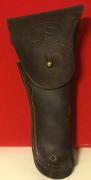 This 45 holster is made by the PERKINS DAMBELL CO. Dated 1917 and inspected by R.J.M. This holster has been modified by the owner by removing the typical wire loop mounting wire. The rear cutouts for the belt have been modifier to fit a garrassion belt. The internal wood block has also been removed. ...Read and See More