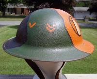 This 89th Division helmet is rather unique in the way the outside is divided into 5 separate pie shaped areas for the different paint. there appears to be a gloss paint used.. The 89th Division insignia is on each side of the helmet each with a slight variation. The liner is missing but there is a  ...Read and See More