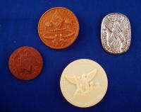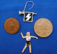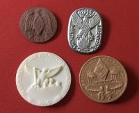 The Bdges consist of A- 1935 German Youth Festival B- 1938 Donation Badge C- 1939 District Meeting of the Frankonian Hitler Youth D- 1939 National Sports Competition. The badges are made from a combination of pressed paper, Tin, and white plastic.