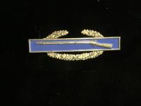 This U.S.Army Combat Badge is just a really nice one piece construction in Sterling. There is no maker mark just the sterling in raised letters. The clutch back catches are also marked Sterling. The badge has full blue paint background and appears to never have been polished or abused.