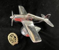 This airplane cigarette lighter is something new to me. This plane is made of non ferrous medal and is chrome plated. The body is 5.5" long and the wings are 7.5: wide and mounted on a pedestal. The plane looks like a couple single seat fighter planes mixed together.