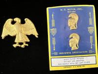 The cap badge is a beautiful gold Eagle which the photo does not capture how great it looks. The reverse has a threaded stud with a bronze mounting disk. There are no makers mark. The two collar insignia are still on the original N.F. Meyer heavy card display.