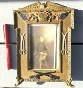From my collection a nice period WWI photo frame that seems to cover just about all. On the top we have the drum and bugle with two American flags on the sides ate crossed Calvary swords and at the bottom crossed cannons. This frame has a nice photo showing areal nice 3rd Division patch. The frame ...Read and See More